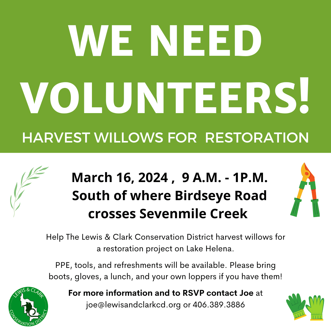 Join us in cutting dormant willows for an upcoming lake shore project on Lake Helena! We’ll be meeting at the location noted below at 9 am on March 16. Volunteer agreements will be available to be signed that day. Please bring appropriate gear for the weather–boots, coat, hat, gloves, etc.–as well as your own loppers if you have them. We will have some available to share.  Please RSVP to Joe Kremer-Herman at joe@lewisandclarkcd.org or call 406-389-3886!
